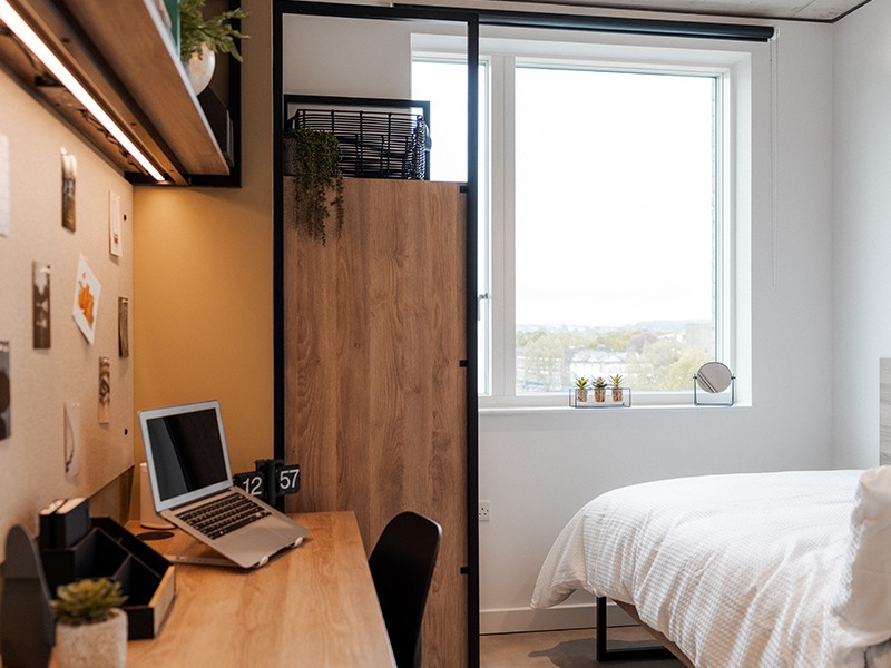 Room inside YourTRIBE's luxury student accommodation. White bedding on the bed, which sits on a wooden bedframe. Wooden desk area, shelving, en-suite and mirrored wardrobes.